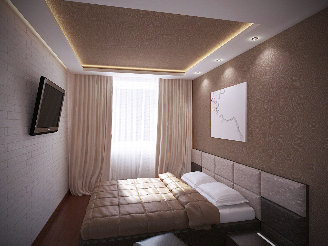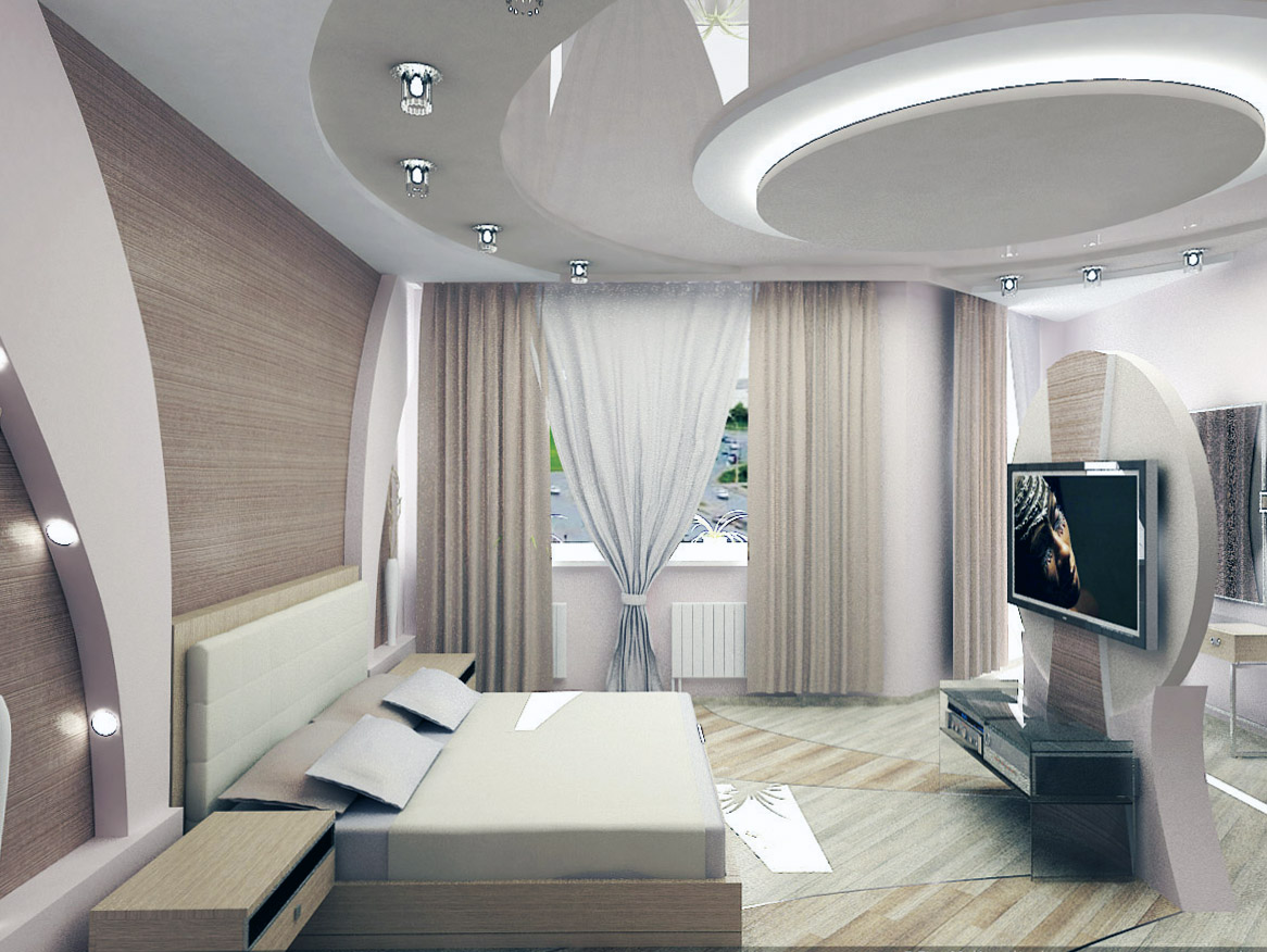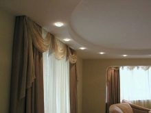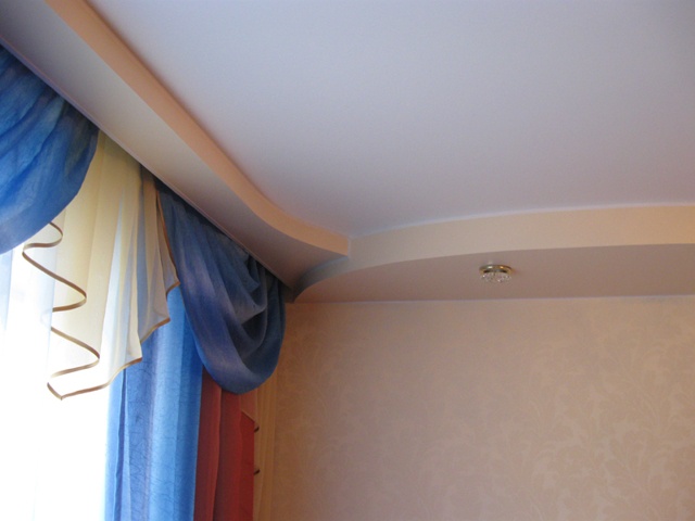 Regardless of the chosen shape of the ceiling, it is recommended to immediately determine the method of fastening the eaves for curtains. It can be attached to the wall or to the ceiling. The latter method is preferable, since it is possible to create a unity of the interior - the curtain seems to be flowing from “nowhere”, which visually expands the room. In this case, the cornice is attached to the ceiling, and the curtain wall closes it. The coating is equipped with a special niche.