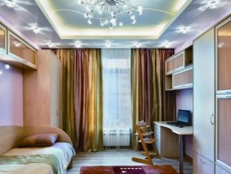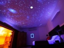 - Fluorescent. Such ceilings are one of the fashionable novelties: the applied pattern flickers in the dark in the presence of ultraviolet lighting. The idea of using such ceilings usually suggests the purpose of the room, as a rule, these are bedrooms and children’s.