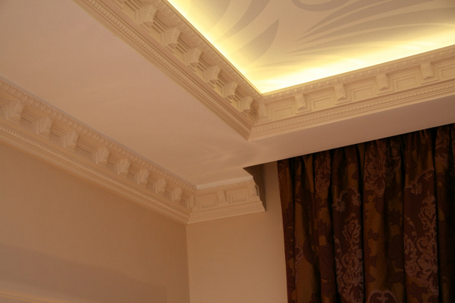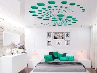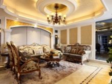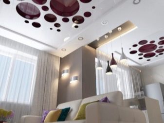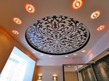 Look great carved ceilings, complemented by lighting. Pictures in the form of animals and birds are suitable for children's rooms, elegant ornaments for classic living rooms, circles for high-tech rooms.