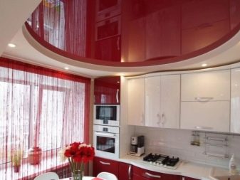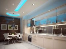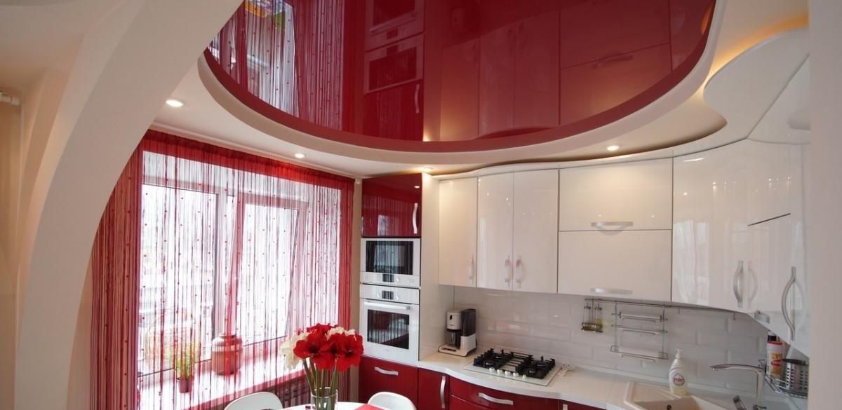 - On the kitchen Looks good bright and contrasting combinations. However, it is recommended to use no more than 3 shades at a time. Most lighting should be located above the working and dining areas.With the help of different colors of the ceiling, you can also zone the kitchen room, while the tones of the ceiling construction should overlap with the shade of the facade of the kitchen set. In a small kitchen, classic designs with a narrow frame around the perimeter and a glossy second level look good.