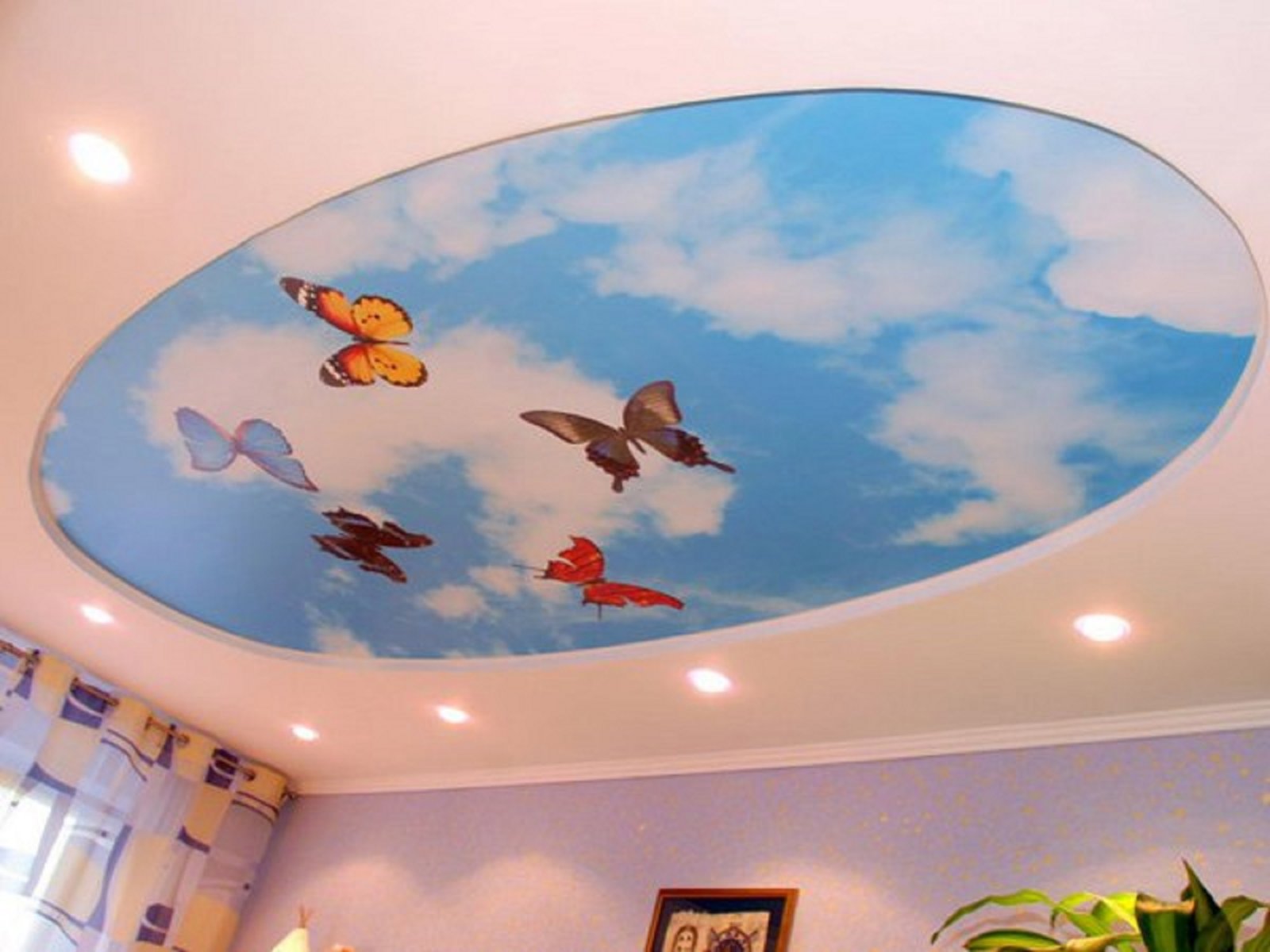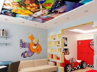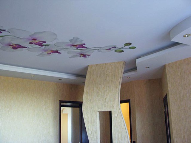 - With photo printing. On these ceilings are applied a variety of drawings. Experts in the field of interior design say that such a ceiling will become the center of the interior, so the design of the remaining surfaces and furniture should be restrained.