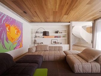 The ceiling of the wall panel looks organically in a country house in a "rustic" style, as well as in the country. You can achieve an authentic atmosphere using traditional wooden wall paneling, but it requires special protection from fire, sunlight and insects. In addition, during operation, it may darken. More simple is the operation of the plastic counterpart (can be colored or imitating wood). In any case, the panels are mounted on the crate.