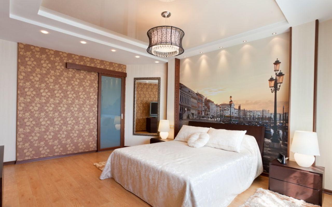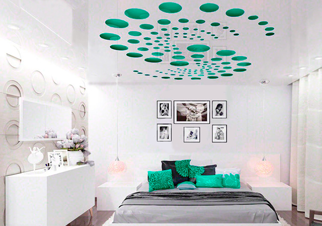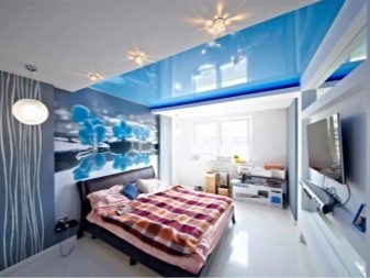 - AT the bedroom Contrasting combinations, sharp corners and bright lights should be avoided. Look good pastel beige, coffee and gray shades. Deep blue has a calming effect, so if you like this color, you can choose such monochrome ceilings. For the bedroom, you can consider the option "night sky", cosmic effects, unobtrusive floral and geometric prints.