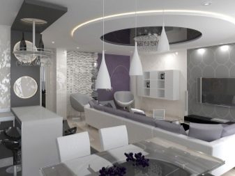 A two-level ceiling is the best solution for zoning small premises and studio apartments. They allow you to divide the room without having to install bulky partitions. For this, experts recommend choosing unusual frames, a combination of several colors.We must not forget about the different intensity of lighting in the studio.