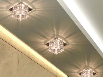 Lamps and lamps can be white and daylight, to give neon radiation. Since a minimum of 7-10 spotlights and a main chandelier are required, care must be taken to reduce energy costs. To do this, use energy-saving lamps.