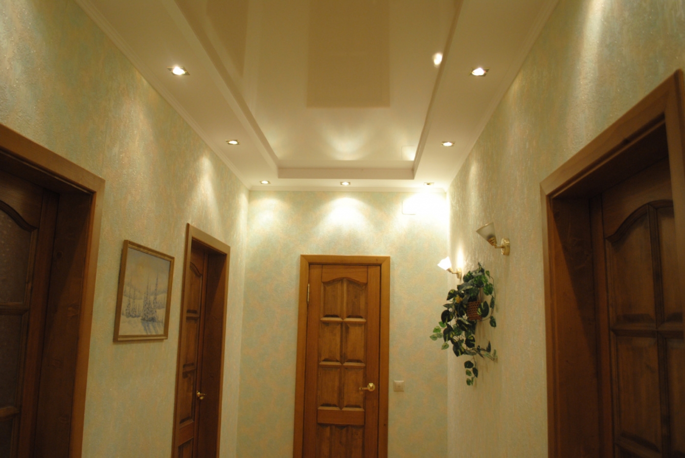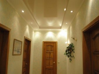 - AT the hallway the light ceiling will allow you to visually expand the room and make it more interesting. It is better to give preference to glossy surfaces in a narrow frame (for example, wavy), which are universal in the corridor of any size.