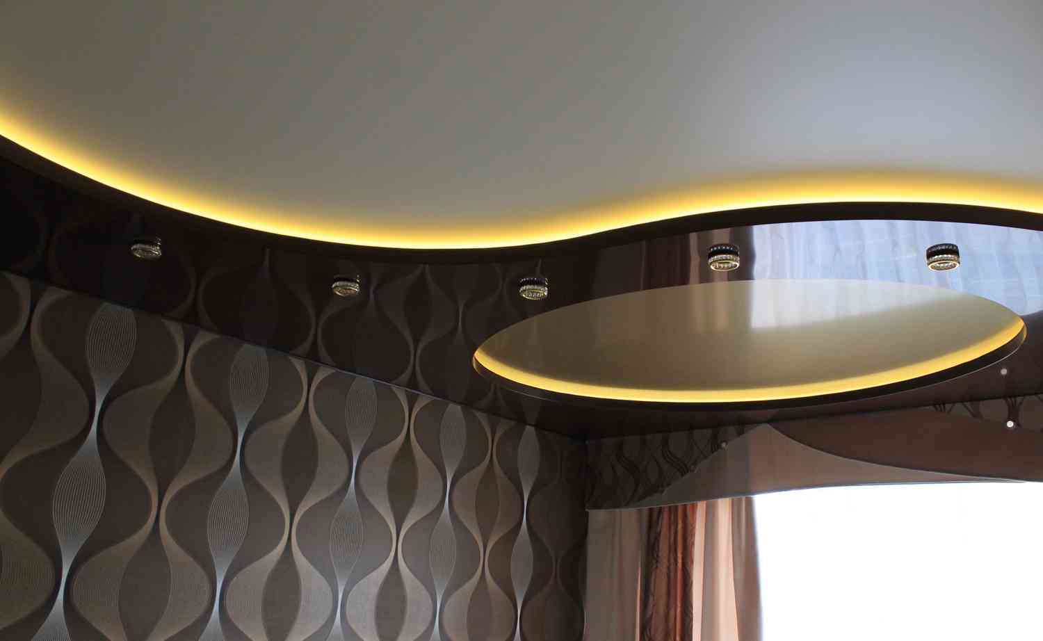 - Curvilinear the ceiling is more complicated but more popular. It can imitate various forms, which ultimately visually changes the geometry of the room.