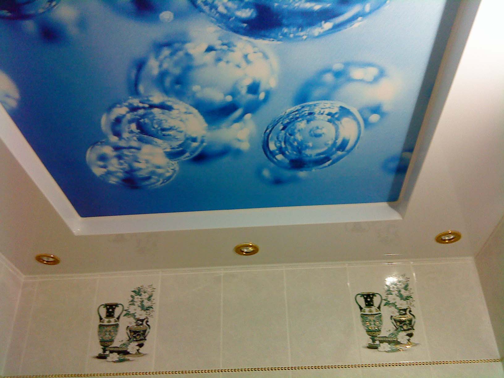 - For bathroom You can use designs in the marine theme, as well as canvases in blue and white colors. It is not recommended to mount complex structures. As the lighting is better to use the built-in lights.