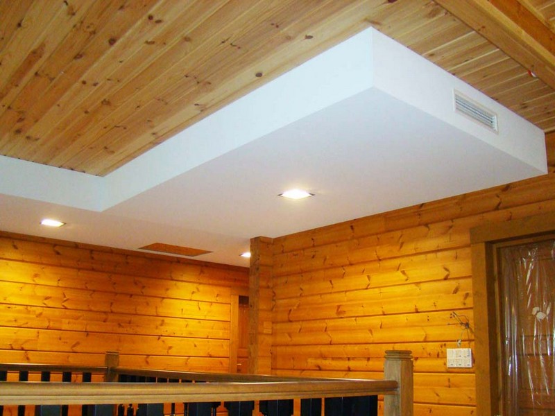 In a wooden house, a combination of drywall box and battens or battens as a material for the first level will be successful. The box can be painted in a light or brown shade.