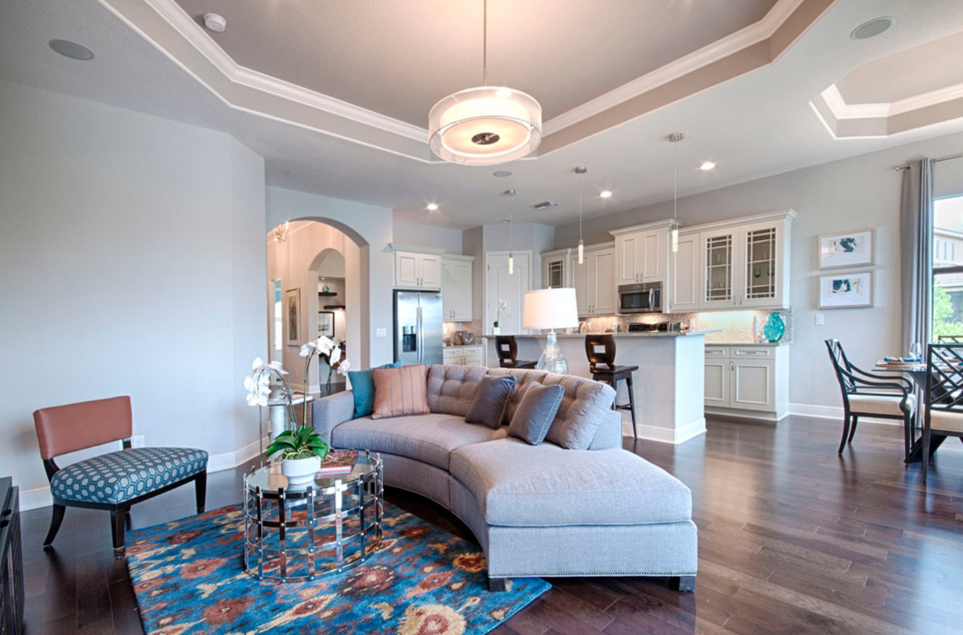 - Circle or semicircle. Usually located above a certain area of the room, for example, above the sofa in the living room or table in the kitchen.