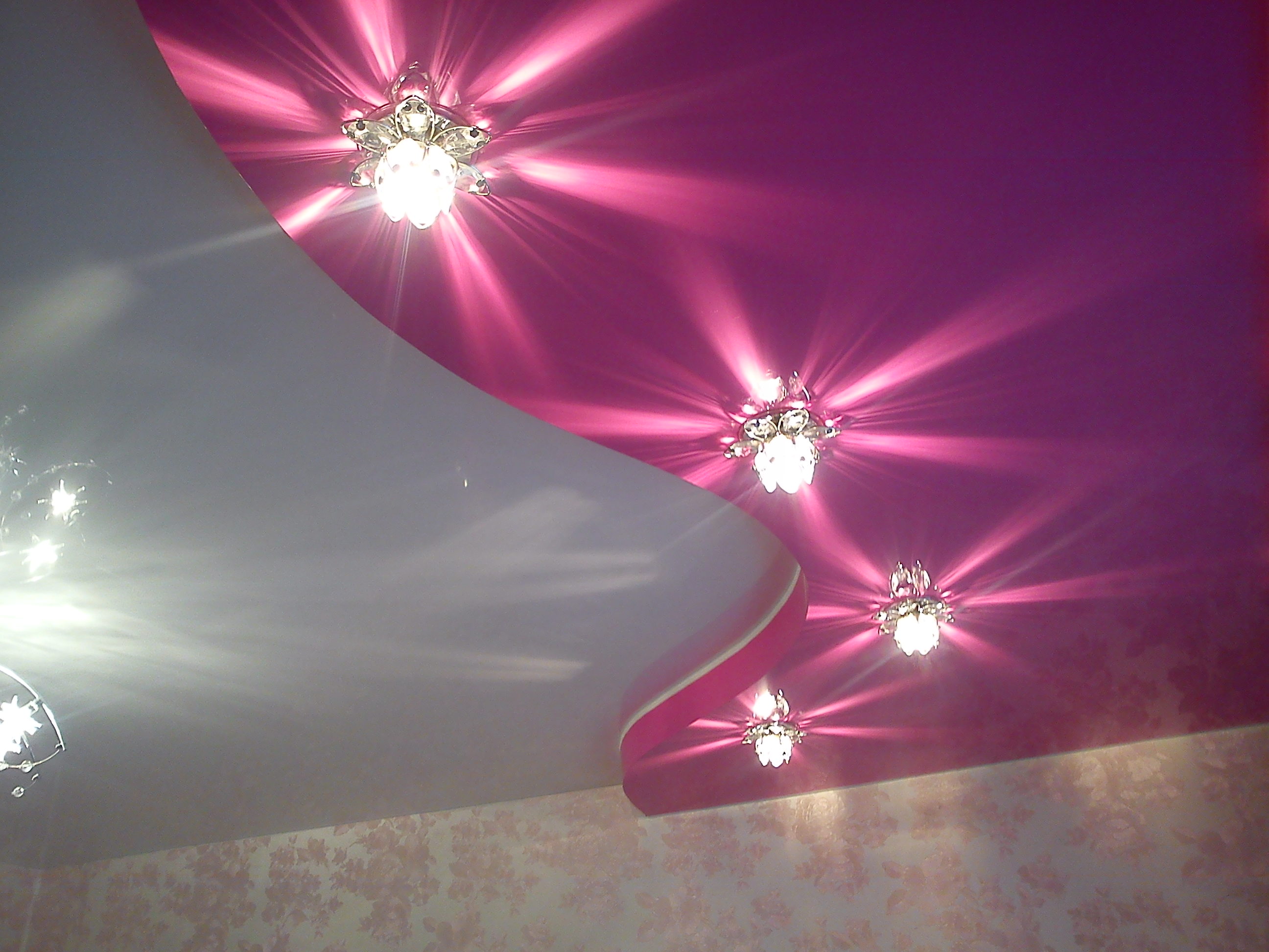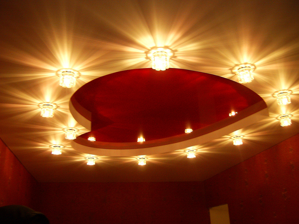 The peculiarity of lighting in a two-tier ceiling is that it allows you to achieve interesting stylistic solutions. However, do not forget about the increased safety requirements for wiring.