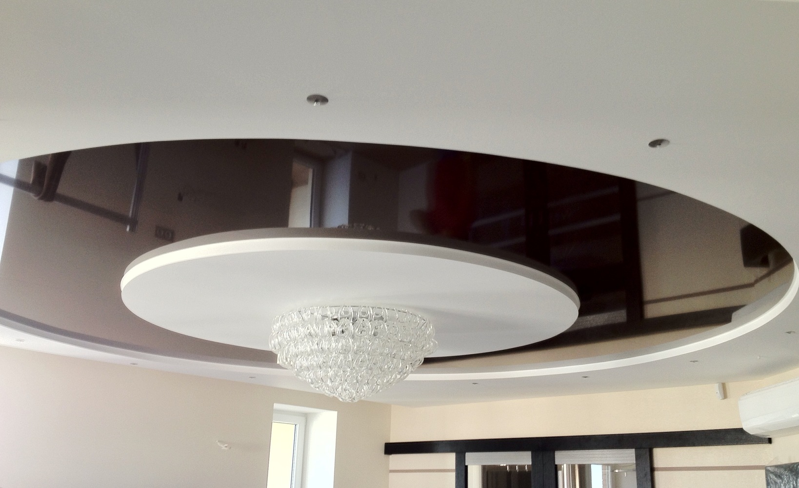 Black matte surface is usually chosen under a beautiful chandelier with gold-plated and crystal elements. The glossy black surface lifts the ceiling and becomes the accent of the interior.