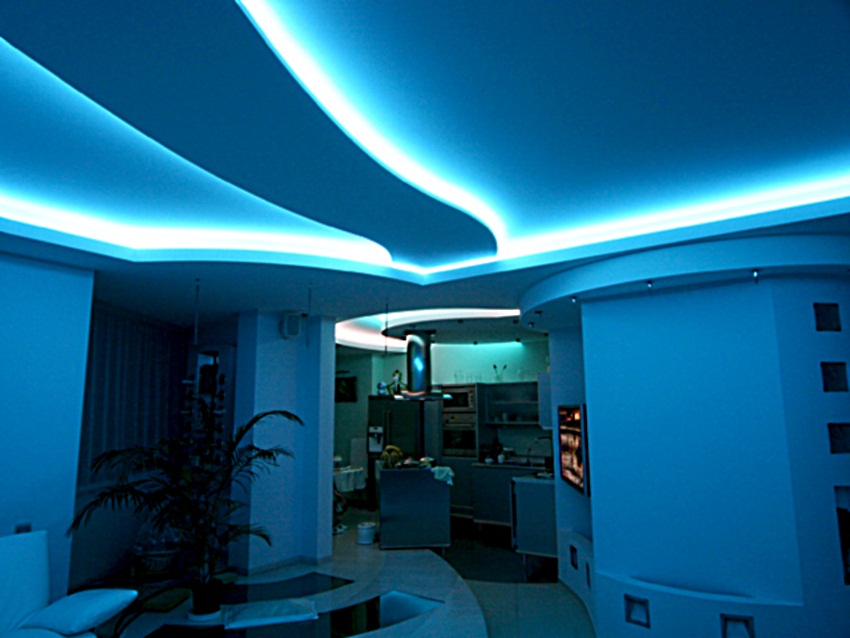 - LED tape. Suitable for mounting on ceilings of complex geometric shapes, due to the flexibility of the tape. They highlight the inside level around the perimeter. Used in conjunction with the controller of the LED strip, which allows you to enable and disable it, change the degree and shade of lighting, choose the appropriate mode.