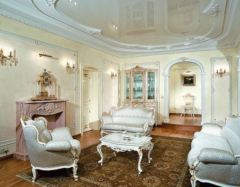 Regardless of the type and design of the ceiling, It is important to remember that it should be combined with the overall style of the room. A good ceiling emphasizes the location of the furniture, combined with the flooring and the texture of the walls, interior accessories. So, in classical interiors it is not recommended to use complex shapes of two-level constructions; traditional straight line variants are appropriate here, as well as circle and ellipse shapes in the center of the room. Dynamic multi-faceted options look good in modern interiors.
