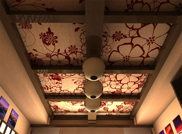 In this design of a 2-tiered ceiling, a vinyl or fabric cloth is stretched onto the frame. Let us consider both materials in more detail: