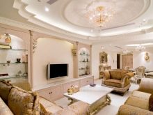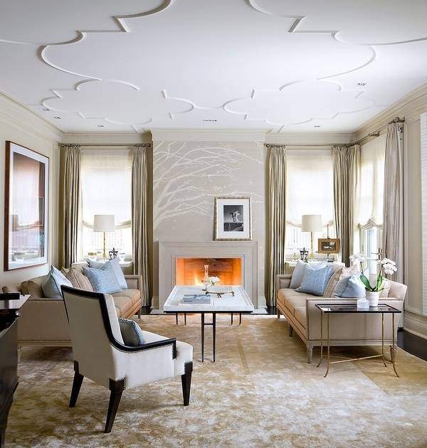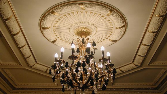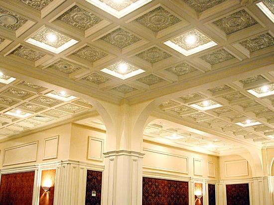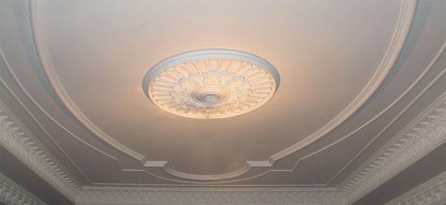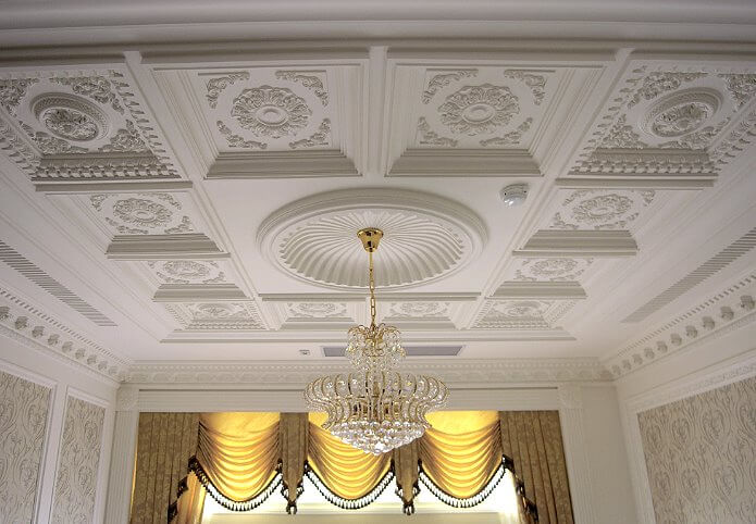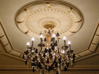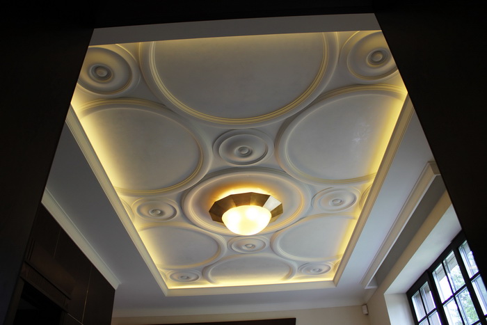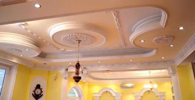Gypsum ceilings are often chosen for cultural facilities. With the help of stucco you can select the place where the chandelier will be located.