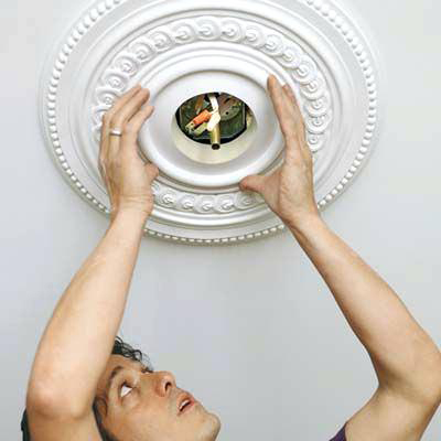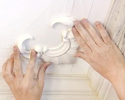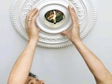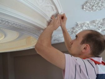 A popular way to install stucco moldings on a ceiling surface is to install them immediately after being removed from the mold. Gypsum product does not have time to become completely dry. If it was necessary to create a lot of plates, and most of them had time to dry, moisten the dry products with water (in a bath or bowl) before carrying out the installation work.