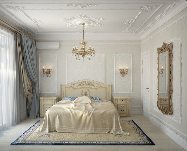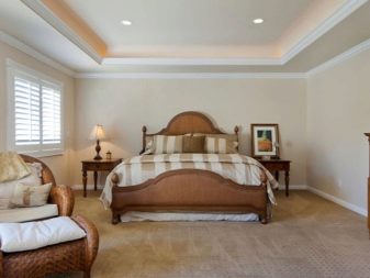 Gypsum ceiling can be chosen for the bedroom. A good option is simple geometric shapes. Such a design has a calming effect on a person.