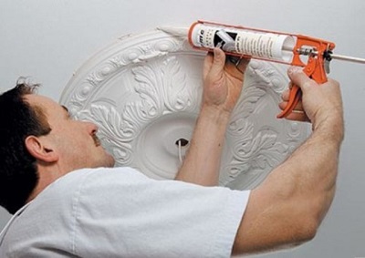 Stucco can be attached to the ceiling surface on a putty or glue, the base of which is water (suitable options - "Mounting", PVA). Each specialist chooses the option that is most convenient for him personally. If the stucco has a significant weight, you can additionally insure and use self-tapping screws.
