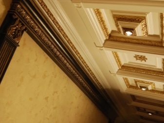 The color range of plinths is predominantly light pastel - pale pink, pale blue, beige or classics of the genre - white. This should coincide with the main background of the ceiling. A small amount of gilding is allowed on the moldings or the use of narrow bandbaseboards with unobtrusive ornament around the perimeter of the room. For these purposes, the best fit polyurethane.