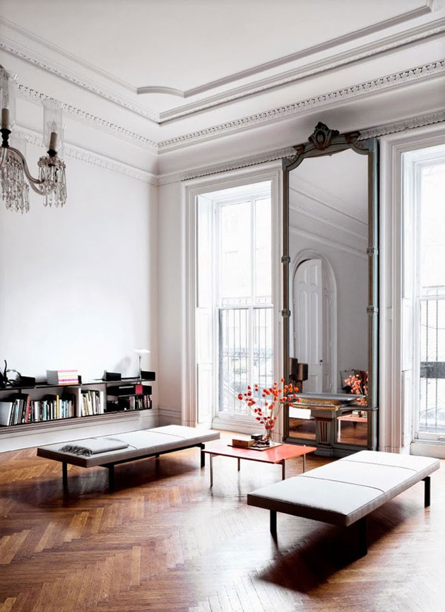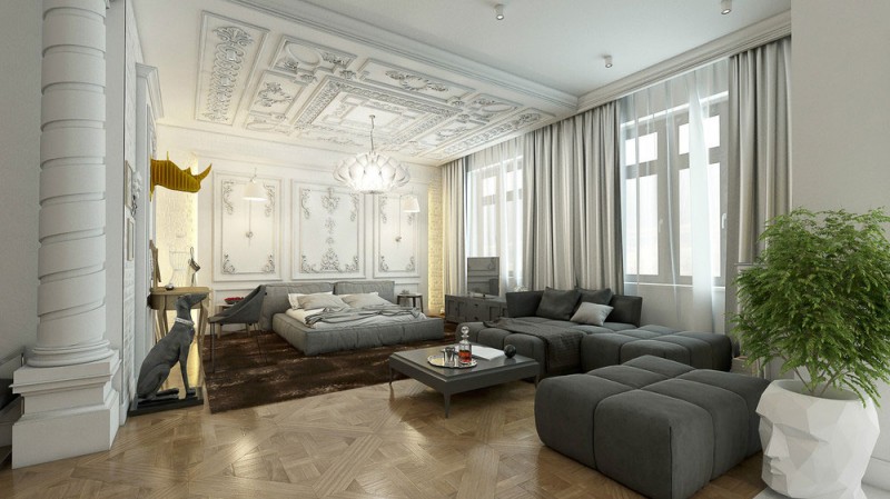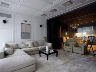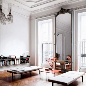Minimalism suggests a discreet design, a minimum of jewelry and maximum functionality. In this case, the central luminaire is not very appropriate, so it makes sense to use ceiling skirting as a masking element for ceiling lighting. Under them or above them you can hide the LED backlight. With the help of them you can make an original pattern on a shelf or divide the room into zones.