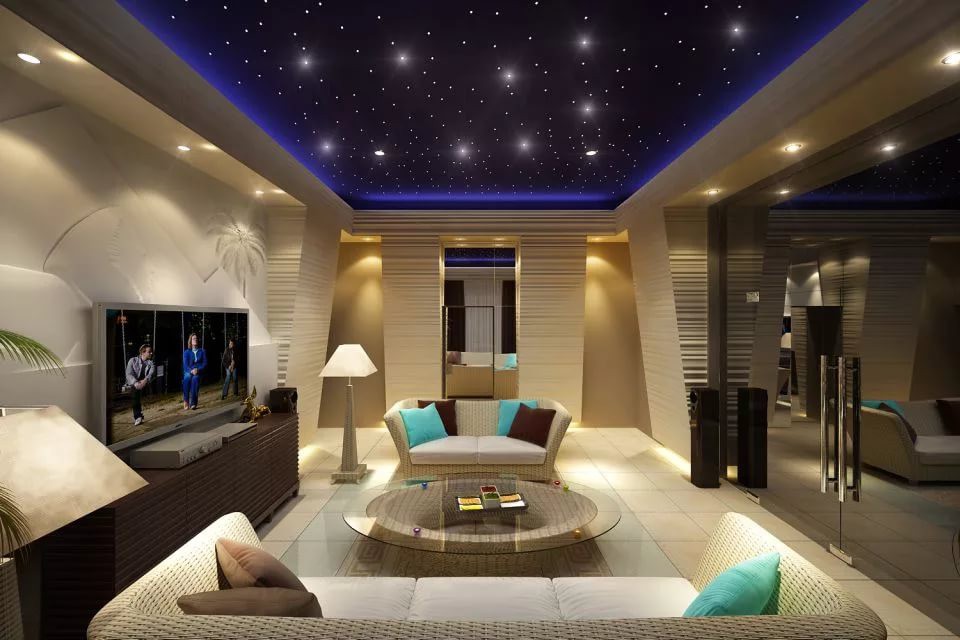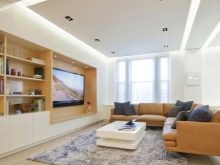 Depending on the style of this room, the ceiling can be an elegant gloss, a subdued shine of a matte surface, mirror inserts in a plasterboard design, a multi-colored line of festive lighting. Respectability and aristocracy will give your living room an exquisite satin ceiling, and multi-level figures will create a sense of height and palace luxury.