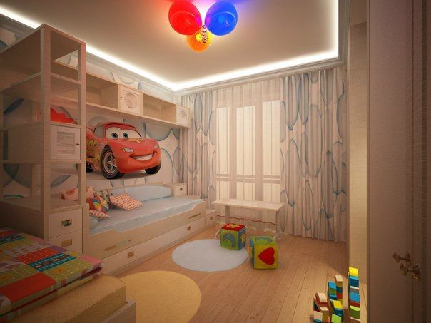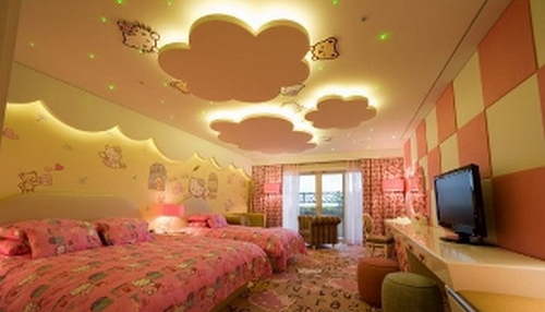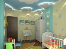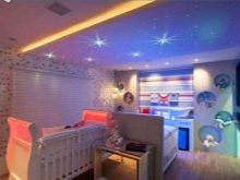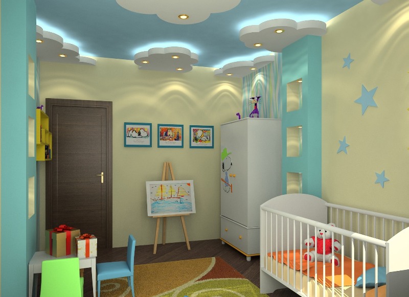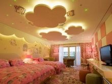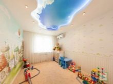 Truly room for the imagination of the designer! The ceiling of the room for a child can turn into a living fairy tale with soaring clouds, favorite characters, bright butterflies and flowers. Funny cartoon prints backlit will allow the baby to overcome the fear of the dark and will protect his sleep.