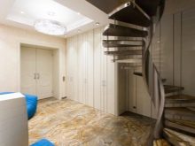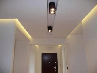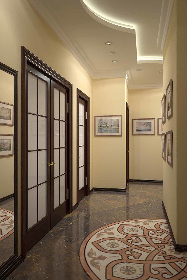 Given the standard dimensions of hallways and corridors in apartment buildings, you should approach the creation of floating ceilings with extreme care so as not to reduce the space even more. The best option would be a bright gloss PVC backlit film or ceiling polyurethane cornices.