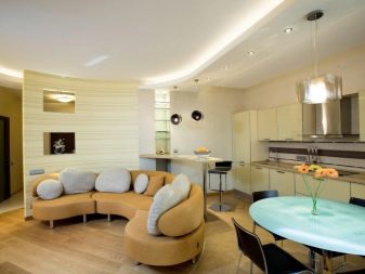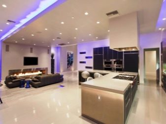 The division of light into cold and warm can be successfully applied in the zoning of the room. For example, a part of the illumination with cold light may fall on the kitchen area, and on the warm side, on the dining area.