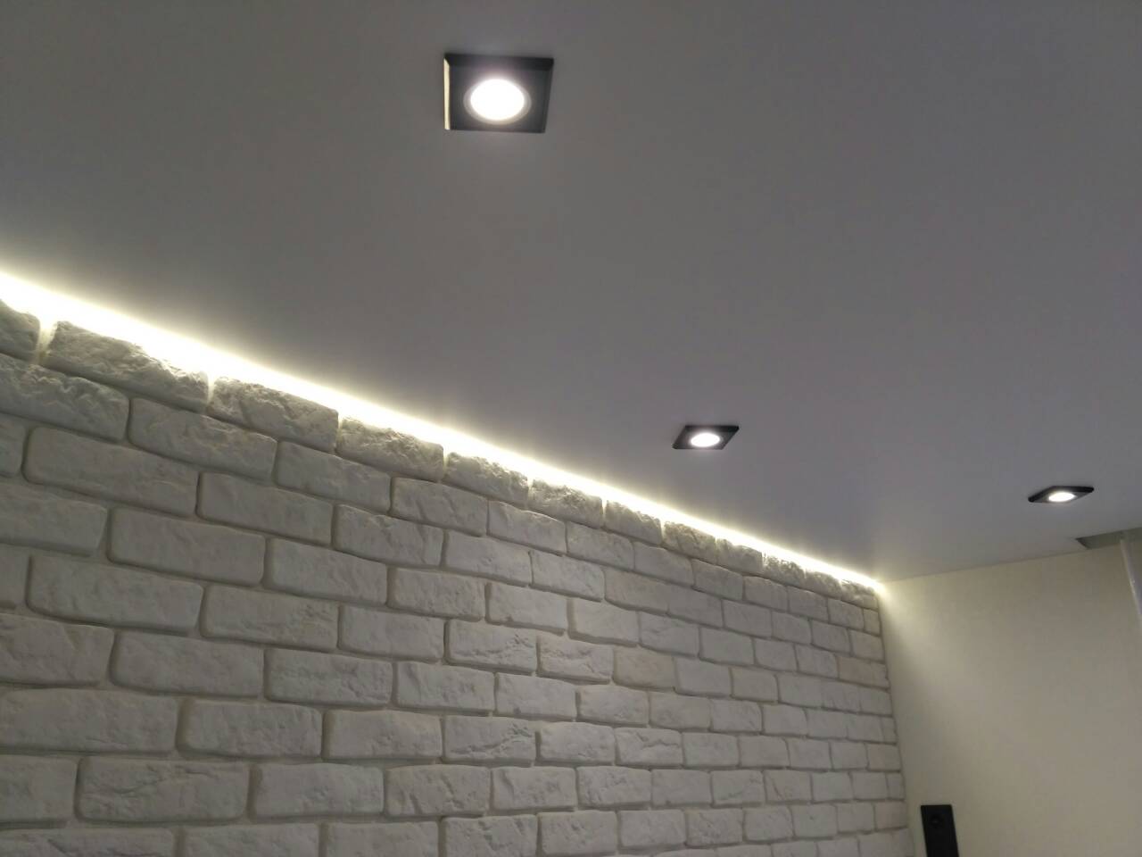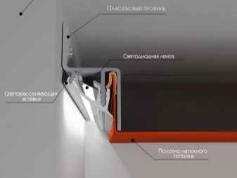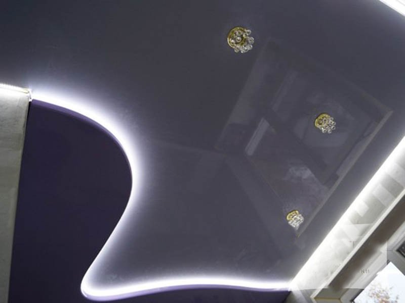 The light source for suspended ceilings are led strip.They are the most economical. Another argument in favor of these devices is safety. Ceiling fabric should not be heated above 40 degrees, otherwise, over time, not to avoid deformation and compression of the texture. The diffusing tape is conveniently inserted into the grooves of the baguette, a certain installation angle creates a feeling of soaring, and the brightness of the backlight is controlled using the remote control or power supply.
