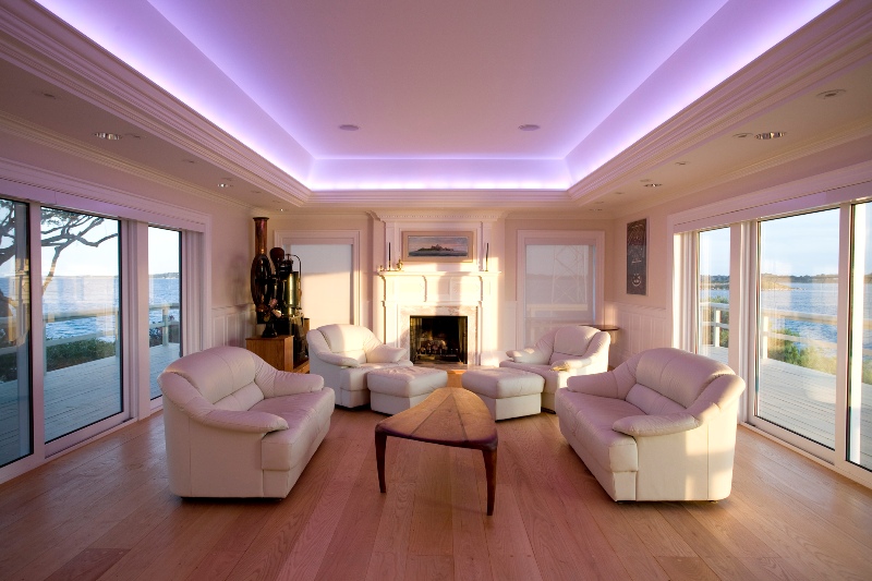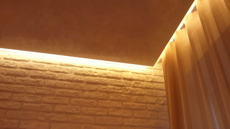 The ledge with led strip is the most economical and less labor-intensive variant of the soaring ceiling, since no action is taken on the ceiling itself. The effect is achieved due to the backlight coming from the eaves. Polyurethane cornice is attached to the upper base of the wall around the perimeter of the room, and an LED strip is inserted into its recess.