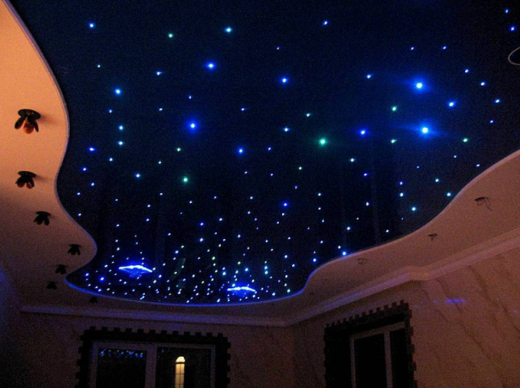 For the bedroom it is best to choose discreet colors and elements, soft flowing light, shades,which will please the eye. After all, the ceiling of the bedroom is what your gaze falls to immediately after waking up. It can be a frosted canvas of light shades with sparkles, a two-level design with floral patterns or a night sky and a glowing milky way. The ceiling in the bedroom can contain both mirrored elements and illuminated mosaic.
