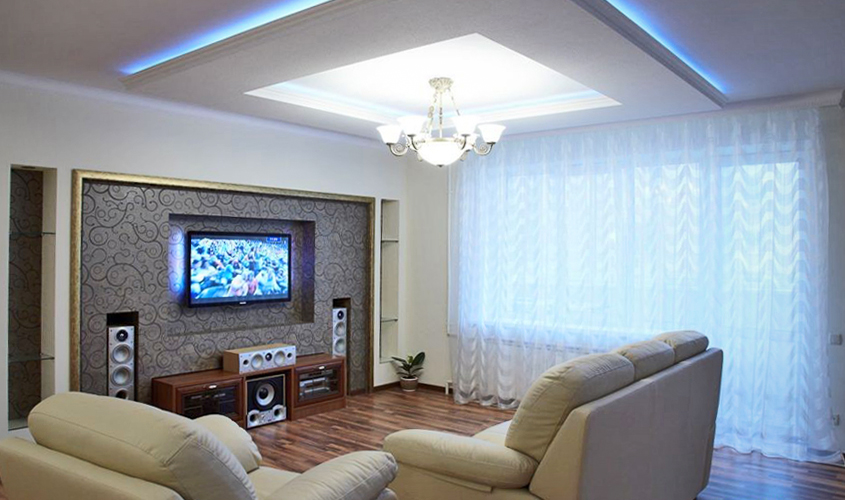 As a rule, the hall is the most spacious room, where the whole family gathers for the rest, feasts are arranged with guests. The living room is the business card of the whole house, so floating ceilings here will be most welcome.
