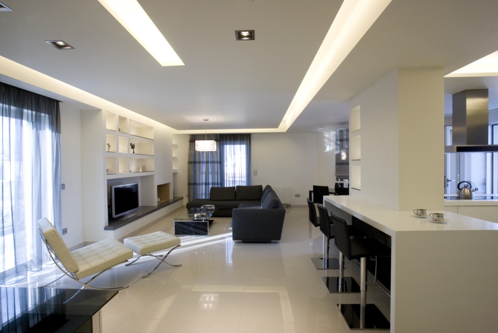 Soaring geometric shapes or abstract elements of drywall will be an unusual decoration of the living room or spacious hall.