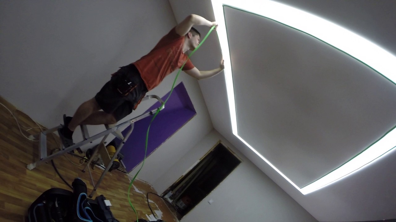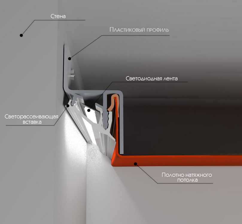 The technology of installing a floating ceiling made of PVC film or fabric is not much different from the standard one. The main difference is the use of special framework-baguettes. An LED strip is placed inside their cavity, and the baguette itself is closed by a transparent cap, which allows the light to diffuse and prevents the groove from accumulating dust.