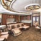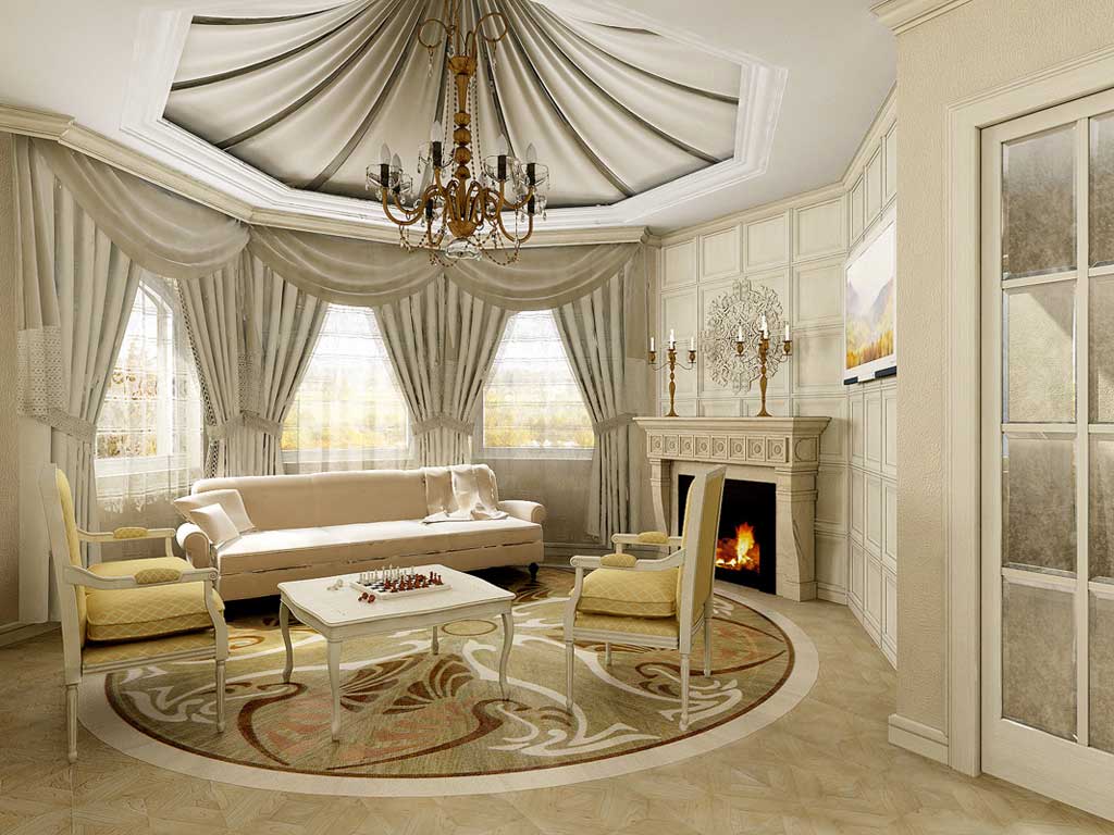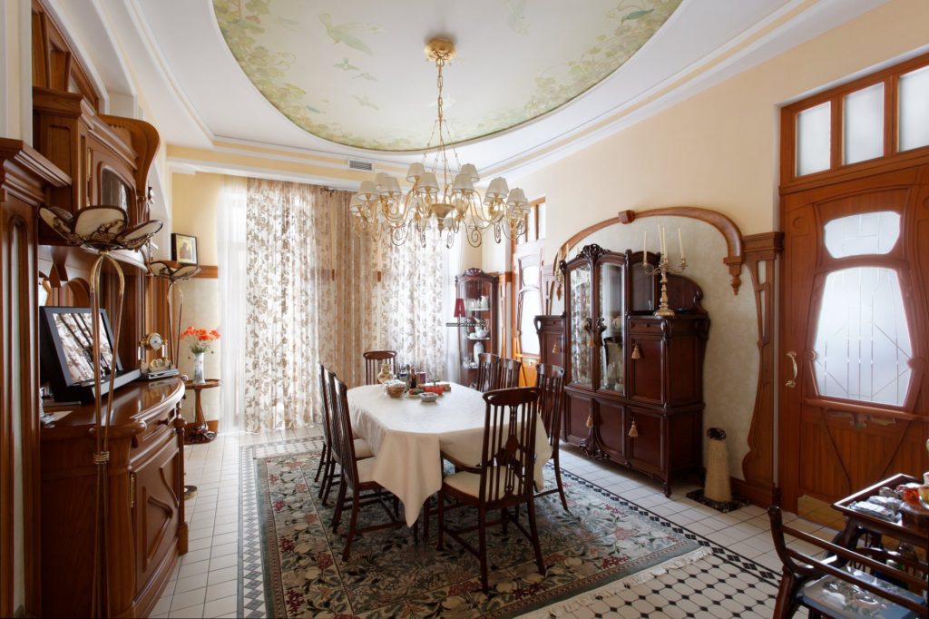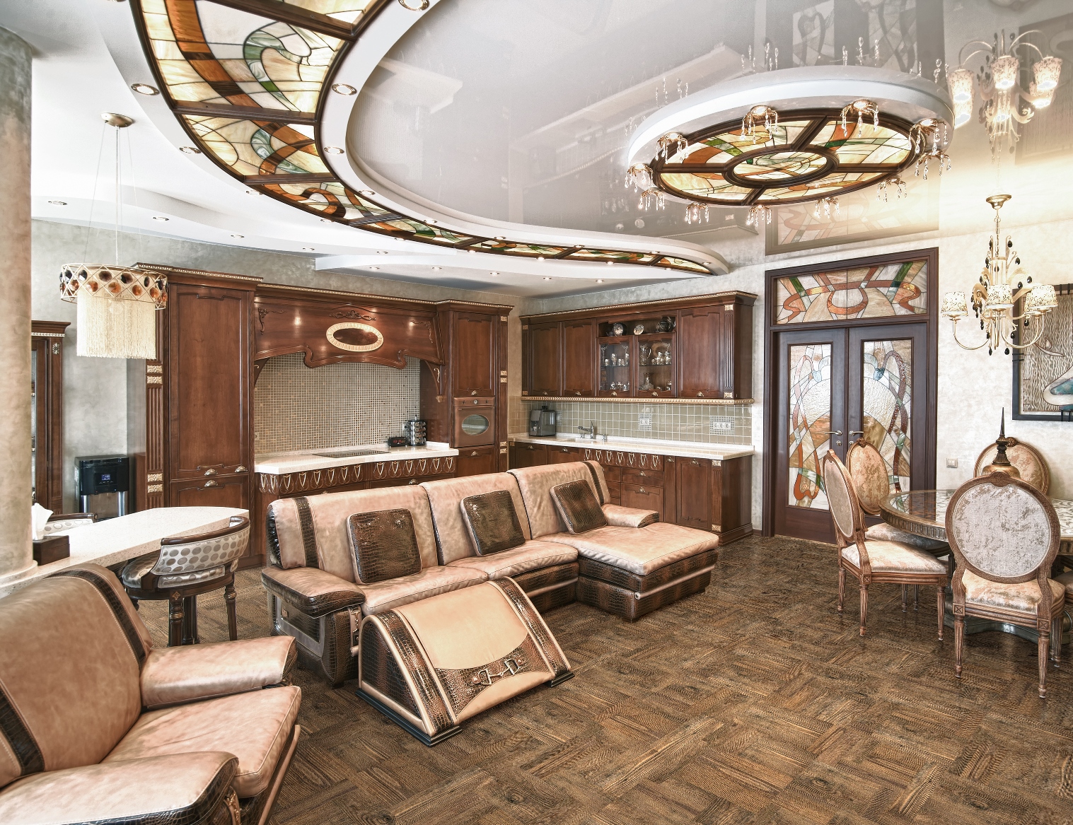 Cream or beige-brown, and also a pale shade of yellow color are well combined with warm walls and pieces of furniture. The presence of a noble brown color or gold inserts is acceptable, sometimes terracotta and emerald. The surface of the ceiling covering in the style of a classic must be perfectly flat; even the smallest defects or cracks are not allowed.
