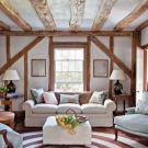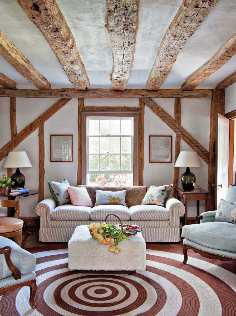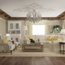 Quite strictly and conservatively looks room decorated in english or victorian style. The classic design of the ceiling in the spirit of the British involves a wooden floor, divided into squares, with floral motifs or, more often, with straight and sharp lines. Typical for European provincial styles, the design of wooden beams ceilings is no exception to the English interior. The classic stucco is also welcome, which can frame the chandelier or act as a border between the walls and the ceiling.