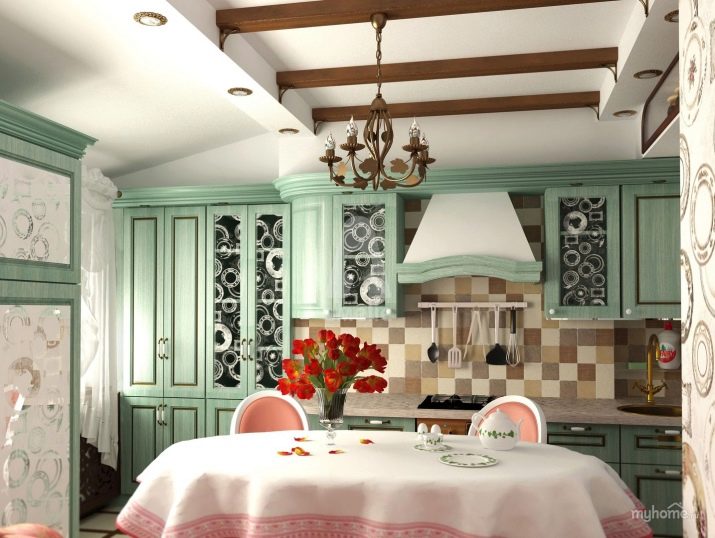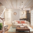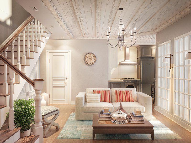 Those who want at least a little rustic comfort among the stone jungles of the city will like it Provence style. This direction reflects the rural way of life of the inhabitants of the south of France, although it is not much different from the long-familiar and beloved country music. The design in this direction is characterized by the presence of natural materials - wood, preferably in its raw form, stone, straw, bamboo. In the color scheme, pastel shades prevail, which add to the room tenderness and romance. Ceiling space can be decorated with hewn wooden beams, painted with white latex paint, but modern drywall is also suitable.Unobtrusive ceiling painting on floristic theme looks original and attractive.