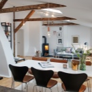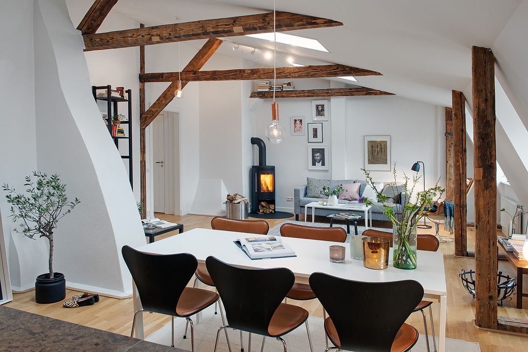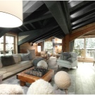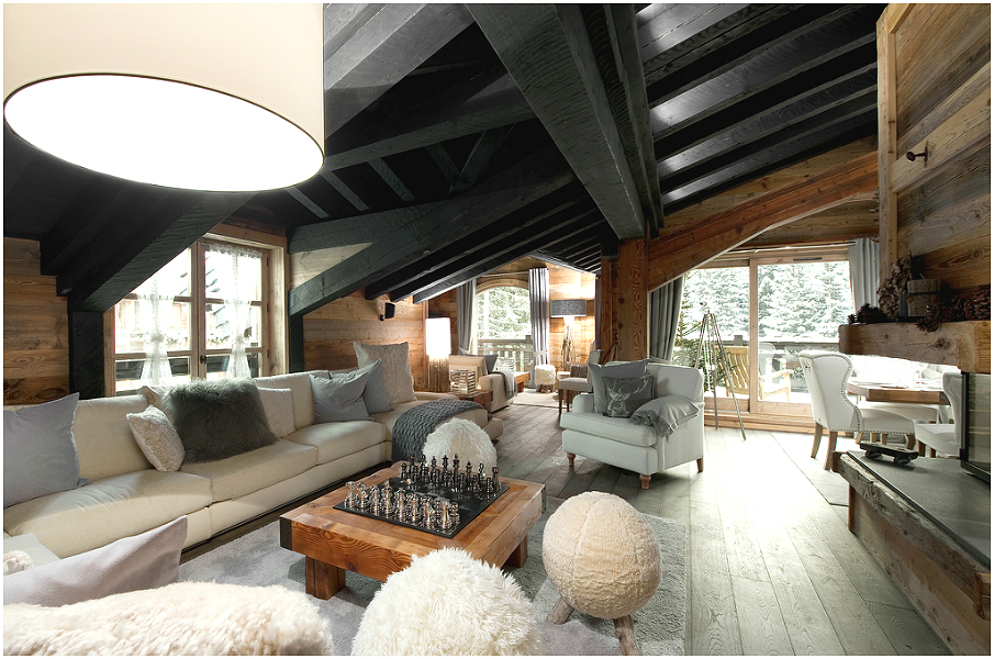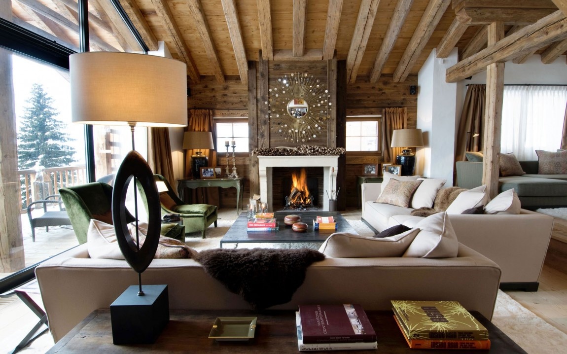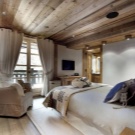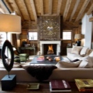 Style chaletThe basis of which was the lifestyle of the inhabitants of the Alpine villages, also has much in common with the village style. However, the chalet literally obliges to use only natural materials without any imitations. Hence, a rather modest color range, limited to shades of brown and beige, as well as white and gray colors. On the ceiling there must be beams made of wood. Formerly, they were a necessary element of the Alpine house construction, and in the modern interior they perform only a decorative function. The rest of the ceiling space can be lined with wooden planks or slats, another option would be plaster.