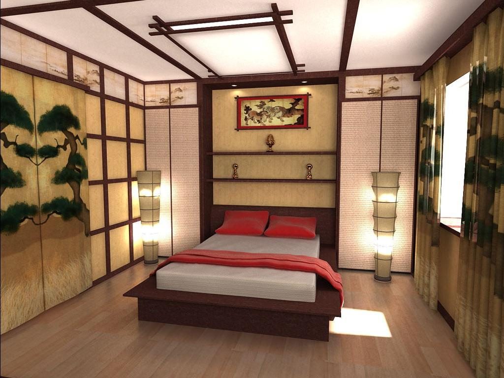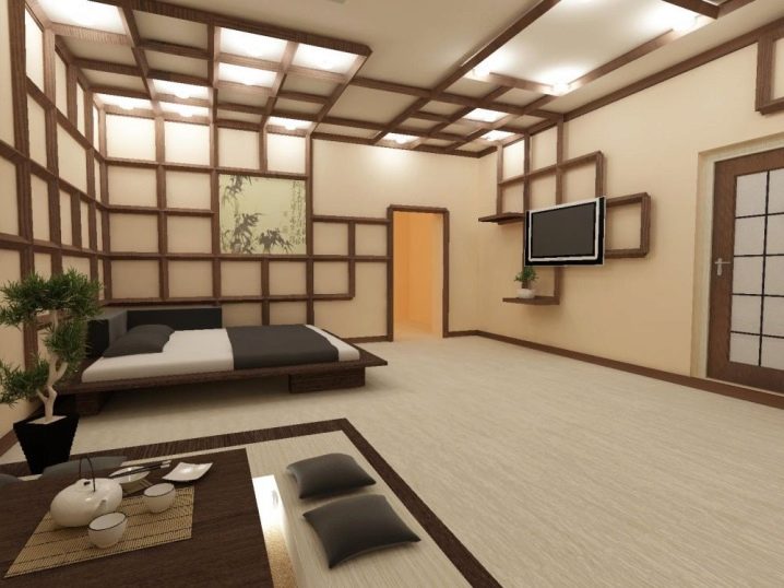 Room decoration in japanese style speaks of the owner’s desire to find harmony with nature even within the walls of his house.This direction is characterized by simplicity and strictness of forms, restrained, but at the same time noble and elegant elements. Among black and white tones, it is permissible to use red and natural wood, for accents you can take the green and the color of sakura. Only strict geometric shapes are suitable for the ceiling. With a sufficient area, it can be segmented by highlighting separate parts with contrasting dark beams. Among the materials usually prefer natural wood or bamboo, glass, paper elements.