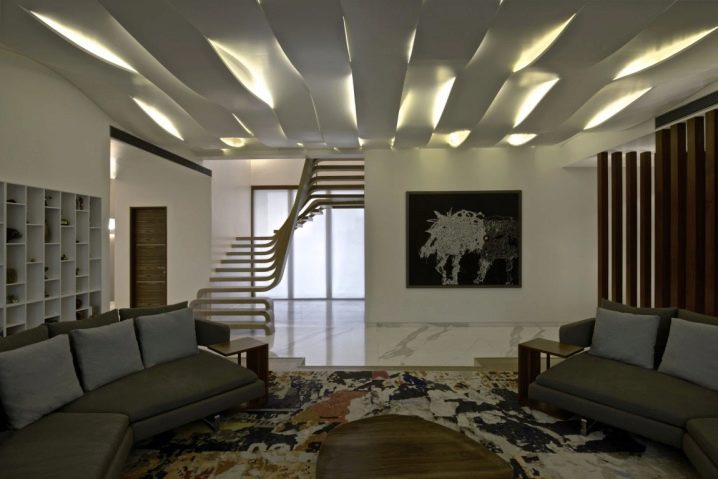 With the development of high technology in the modern world, a direction appeared in the design called high tech. This style is distinguished by its conciseness and functionality, extraordinary solutions. For high-tech, it is important to correctly place accents with the help of lighting, so often the suspended or suspended ceiling is made multi-level.The combination of the characteristic for the style of metal elements of the framework of the Armstrong ceiling covering with the details of regular geometric shapes will also complement the urban interior of the room quite well. In the color scheme, preference is given to white and various shades of gray, black, silver and blue tones.