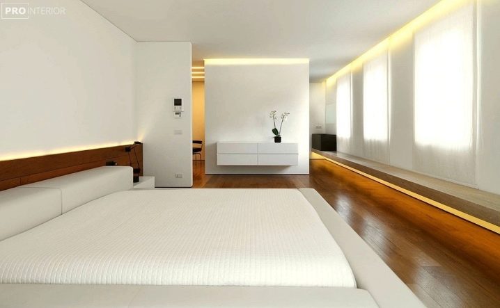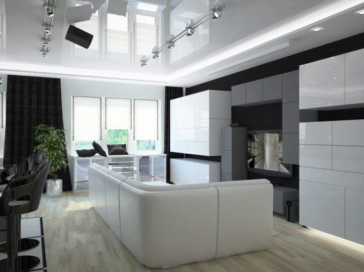 Deprived of unnecessary details, simple and at the same time geometrically clear minimalism quite popular in modern interior solutions. The style completely excludes the use of additional structures in the ceiling space in the form of baseboards or borders. It must be uniform and even, which is effectively achieved with the help of tension structures.