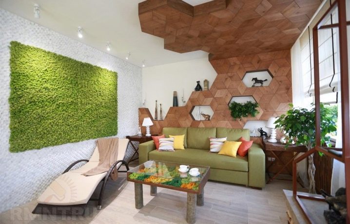 Another recently emerged design direction can be called ecostyle. He appeared against the background of increasing public interest in environmental issues. At the heart of his concept is the desire to preserve intact natural resources, to use secondary raw materials for decorating the apartment. The use of natural materials, preferably wood, is encouraged in the ceiling space solution. On top of the panel can be painted in matte paint in light shades. If the ceiling is simply whitewashed, then it can also be decorated with wood beams. The color spectrum characteristic of this direction includes natural shades and their natural combinations.
