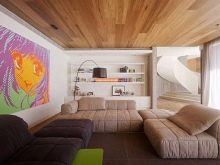 The combined ceiling can be made with the use of wood, metal and plasterboard structures, tension elements. An exclusive option is the creation of paintings on the wooden ceiling or the finishing of some areas with the use of painting.