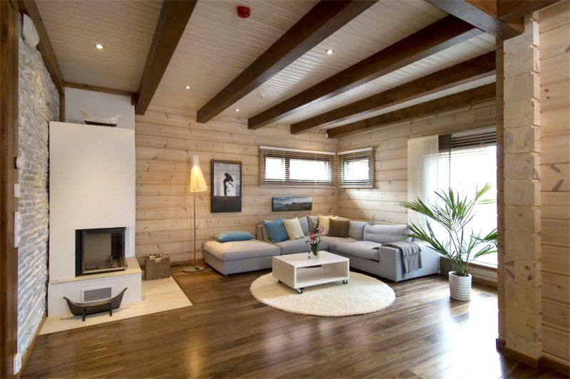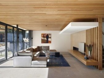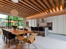 Wood trim is becoming increasingly popular, and not only in the decoration of ceilings, Increasingly, houses are built of wood, and not necessarily located in the village. This environmentally friendly and pleasant in its energy material attracts many. The ceiling, covered with wood, makes it possible to create very stylish solutions, especially since the tree is combined with many materials.