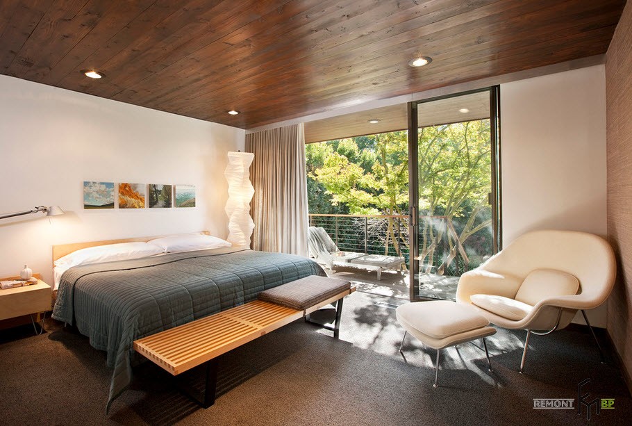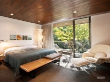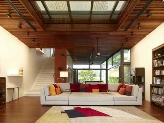 The ceiling is sheathed with clapboard, plywood, made from slats, decorative beams. All these materials will create an atmosphere of comfort and warmth, and if you think well about the idea of the interior, you can create a very interesting design. Such ceilings successfully look at the design of rustic style, country, Provence, loft.