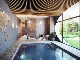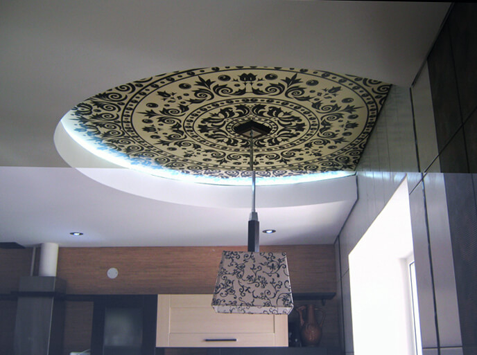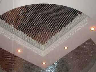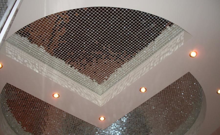 Ceiling design can be supplemented with stucco, mosaic. Thus, you can make accents. Mosaic made up of patterns or images. It firmly holds, if you use the usual tile adhesive. The mosaic can be made of different materials - ceramic elements, colored glass, stones.