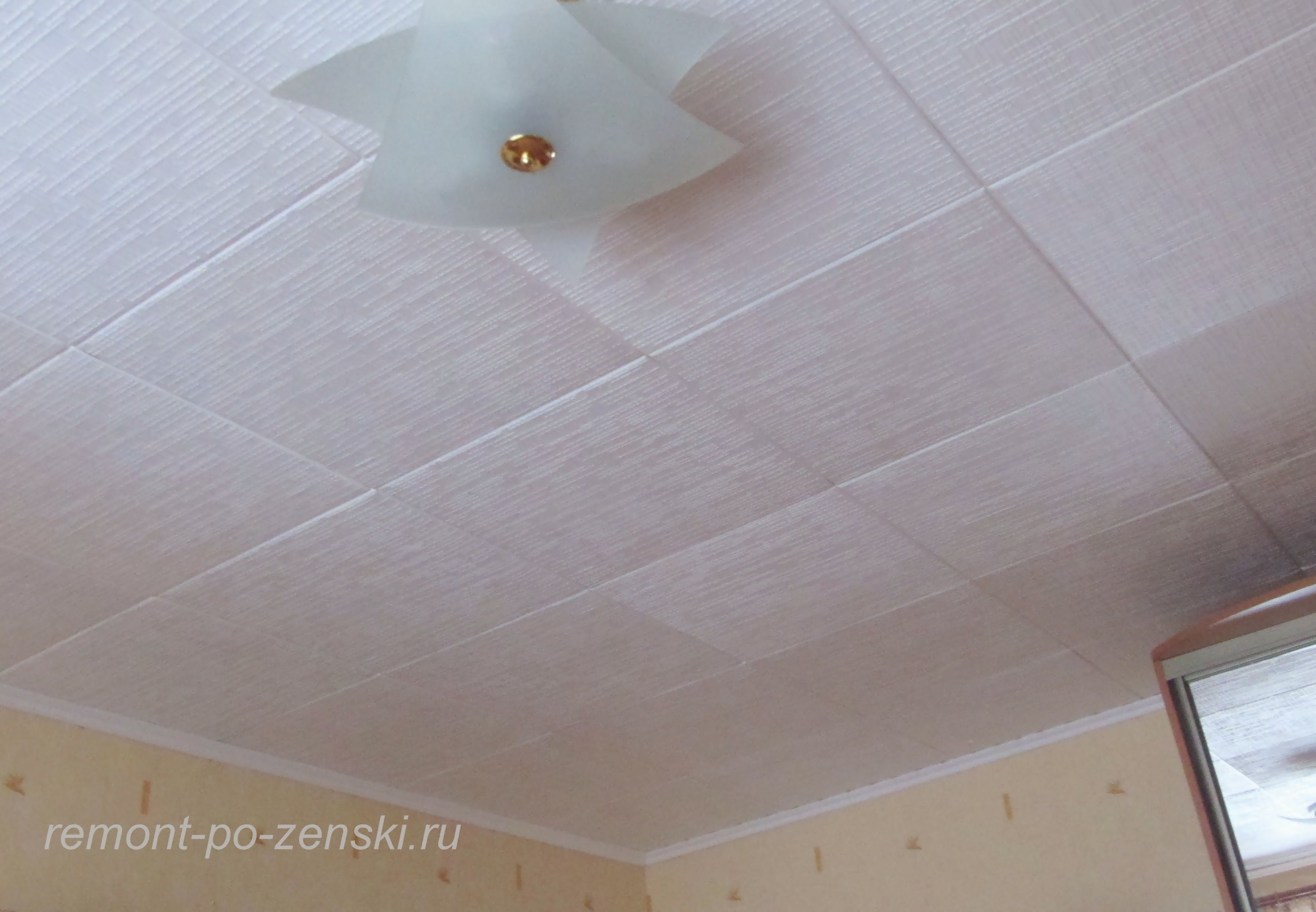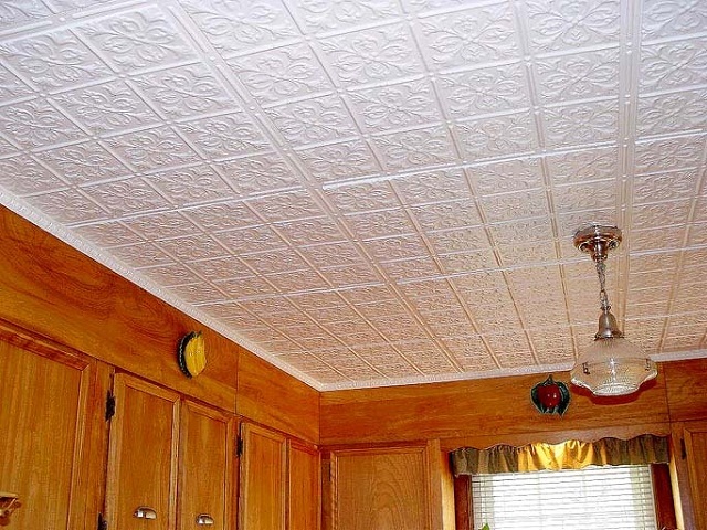 The first option is quite easy to perform. Polystyrene tile is easily glued to the ceiling with ordinary glue provided that the ceiling is well prepared and does not contain old paint, lime or wallpaper. The tile has a large range of patterns. The ceiling will look clean and tidy.
