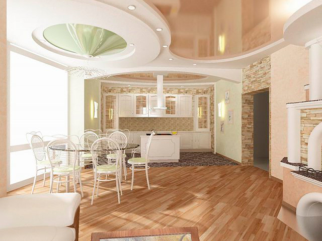 In a country house, suspended ceilings, as well as plasterboard structures are particularly beneficial. The wiring and ventilation wires will be hidden under the ceiling.