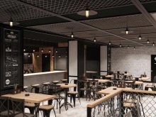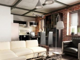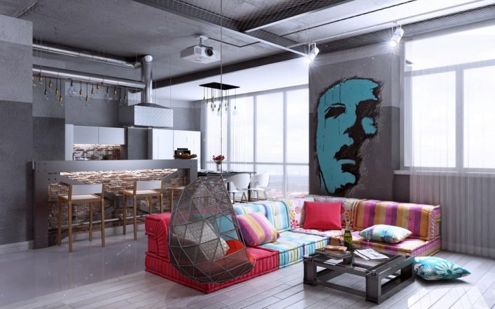 Bare communications and a grid on the ceiling will help to improve and give an interior effect.In studio apartments, the kitchen area can also be separated by a grid on the ceiling. The multicolored soft corner looks bright.